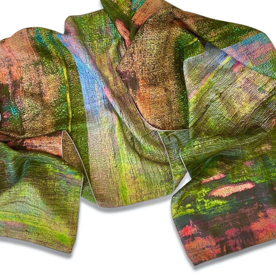 Exquisite limited edition Habotai silk scarf, designed from an original abstract artwork, printed in permanent reactive inks which bond to the silk fibers to create durable, beautifully rich color. This design features soft coral, violet and golden emerald green tones. Brilliantly versatile, this can be worn as a neck scarf, as a head scarf, as a shawl, and as a belt. Rolled baby hem for a delicate and durable finish. Machine washable.